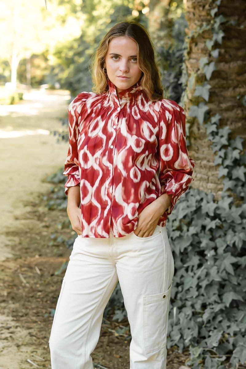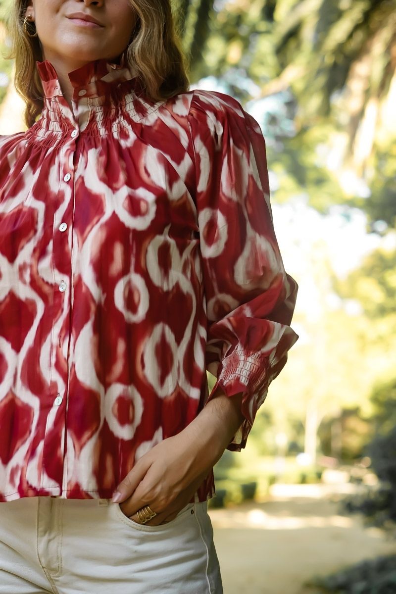 La Camisa Ikat Teja es una camisa de estampado ikat de poliéster rayado de manga larga con manga afarolada y cuello y manga fruncida.