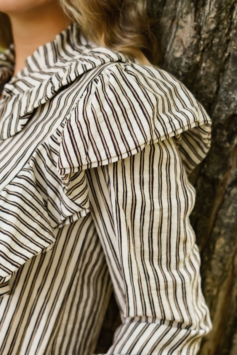 La Camisa Rayas Beige es una camisa de rayas de manga larga con volantes en los hombros y un estampado de rayas ideal y súper ponible.