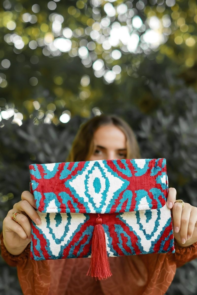45,00 € IVA INCLUIDONuestra Cartera Ikat Rojo Turquesa está fabricada en terciopelo estampado ikat de dos colores. Va forrada por dentro y es ideal para dar a tus looks de invitada un toque de lo más especial. Es un complemento básico que nunca pasará de moda y que podrás usar aunque pasen los años. Tiene un borlón de seda a contraste y un botón central. Disponemos de más estampados para escojas el que más te gusta.