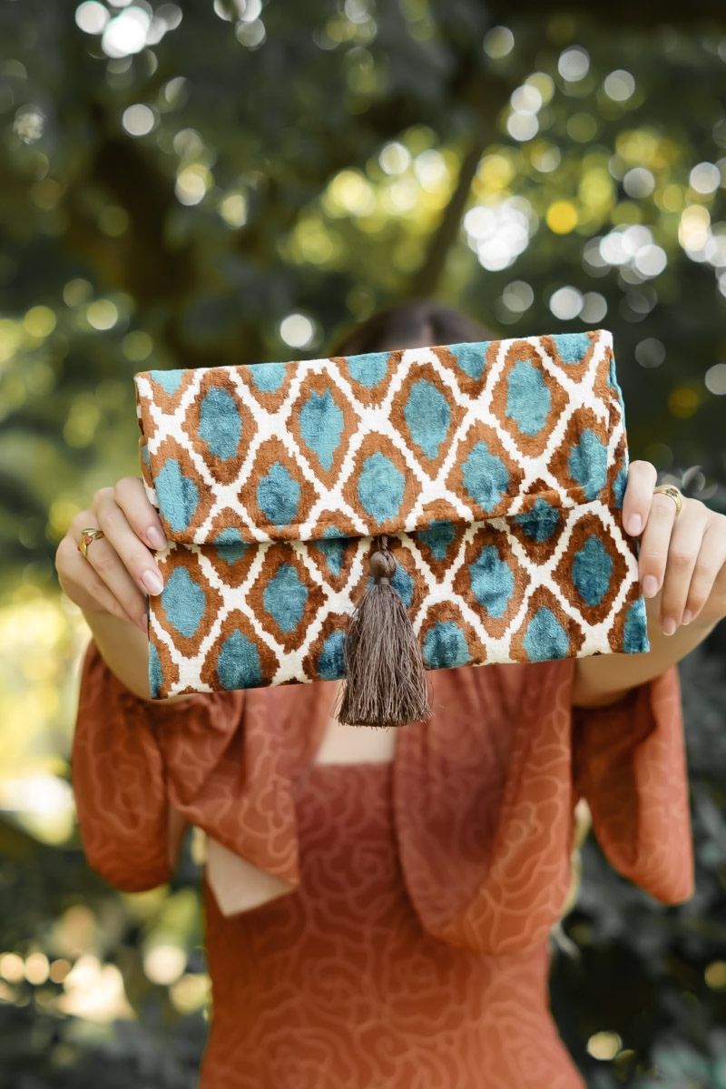45,00 € IVA INCLUIDONuestra Cartera Ikat Marrón Turquesa está fabricada en terciopelo estampado ikat de dos colores. Va forrada por dentro y es ideal para dar a tus looks de invitada un toque de lo más especial. Es un complemento básico que nunca pasará de moda y que podrás usar aunque pasen los años. Tiene un borlón de seda a contraste y un botón central. Disponemos de más estampados para escojas el que más te gusta.