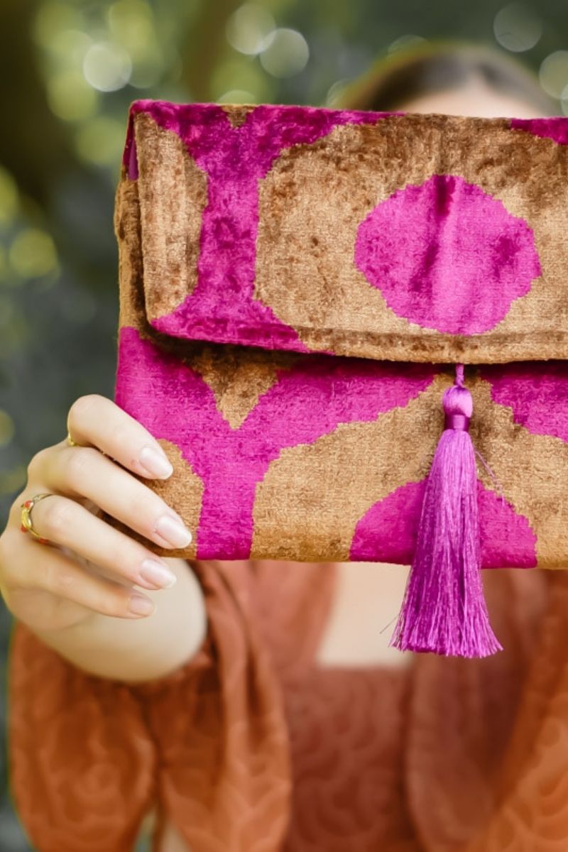 45,00 € IVA INCLUIDONuestra Cartera Ikat Marrón Fucsia está fabricada en terciopelo estampado ikat de dos colores. Va forrada por dentro y es ideal para dar a tus looks de invitada un toque de lo más especial. Es un complemento básico que nunca pasará de moda y que podrás usar aunque pasen los años. Tiene un borlón de seda a contraste y un botón central. Disponemos de más estampados para escojas el que más te gusta.