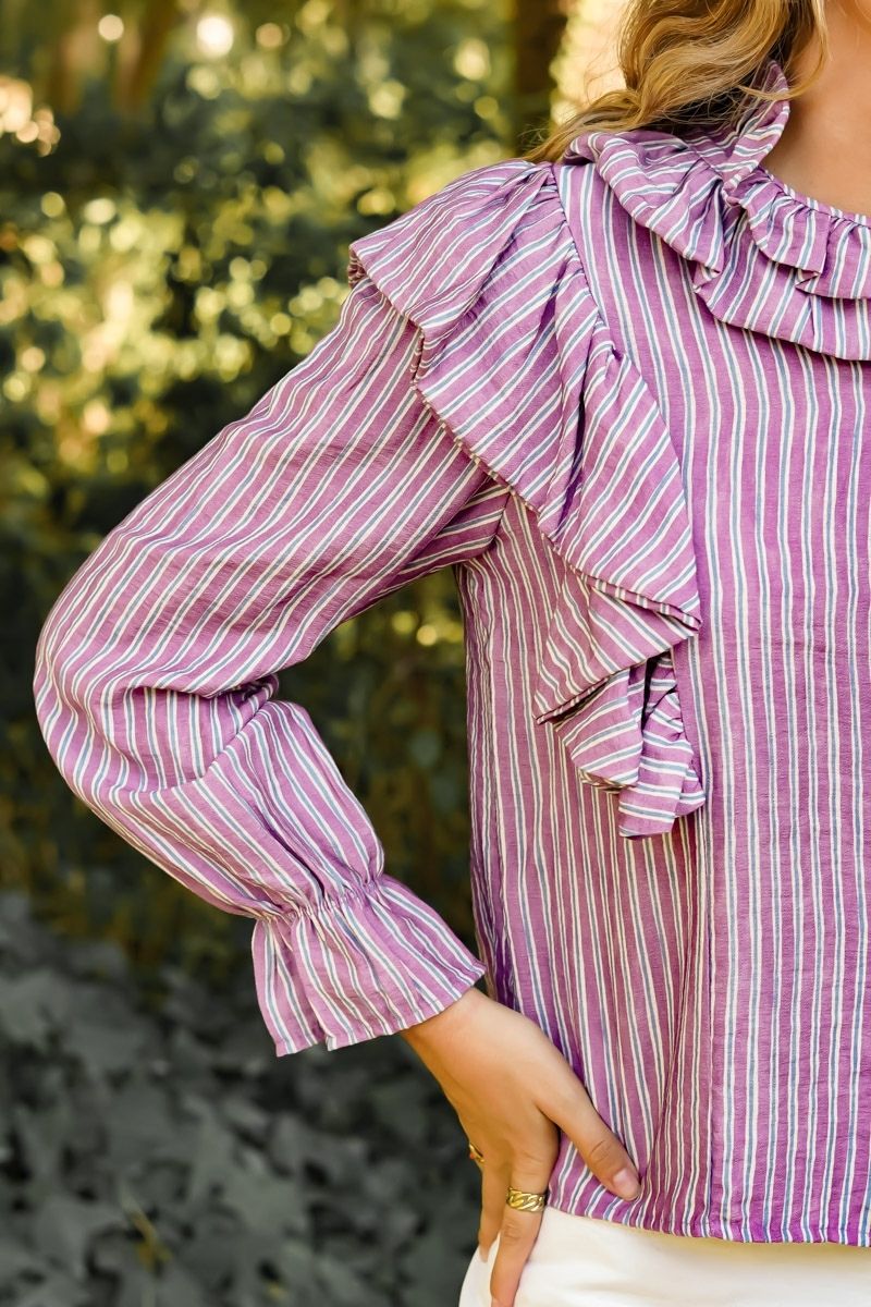 26,00 € IVA INCLUIDOLa Camisa Rayas Lila es una camisa de rayas de manga larga con volantes en los hombros y un estampado de rayas ideal y súper ponible.