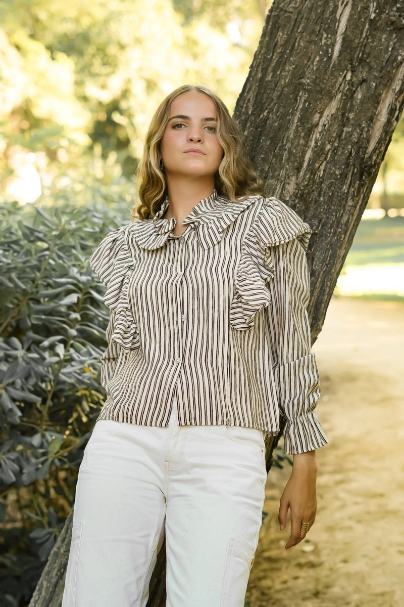 26,00 € IVA INCLUIDOLa Camisa Rayas Lila es una camisa de rayas de manga larga con volantes en los hombros y un estampado de rayas ideal y súper ponible.