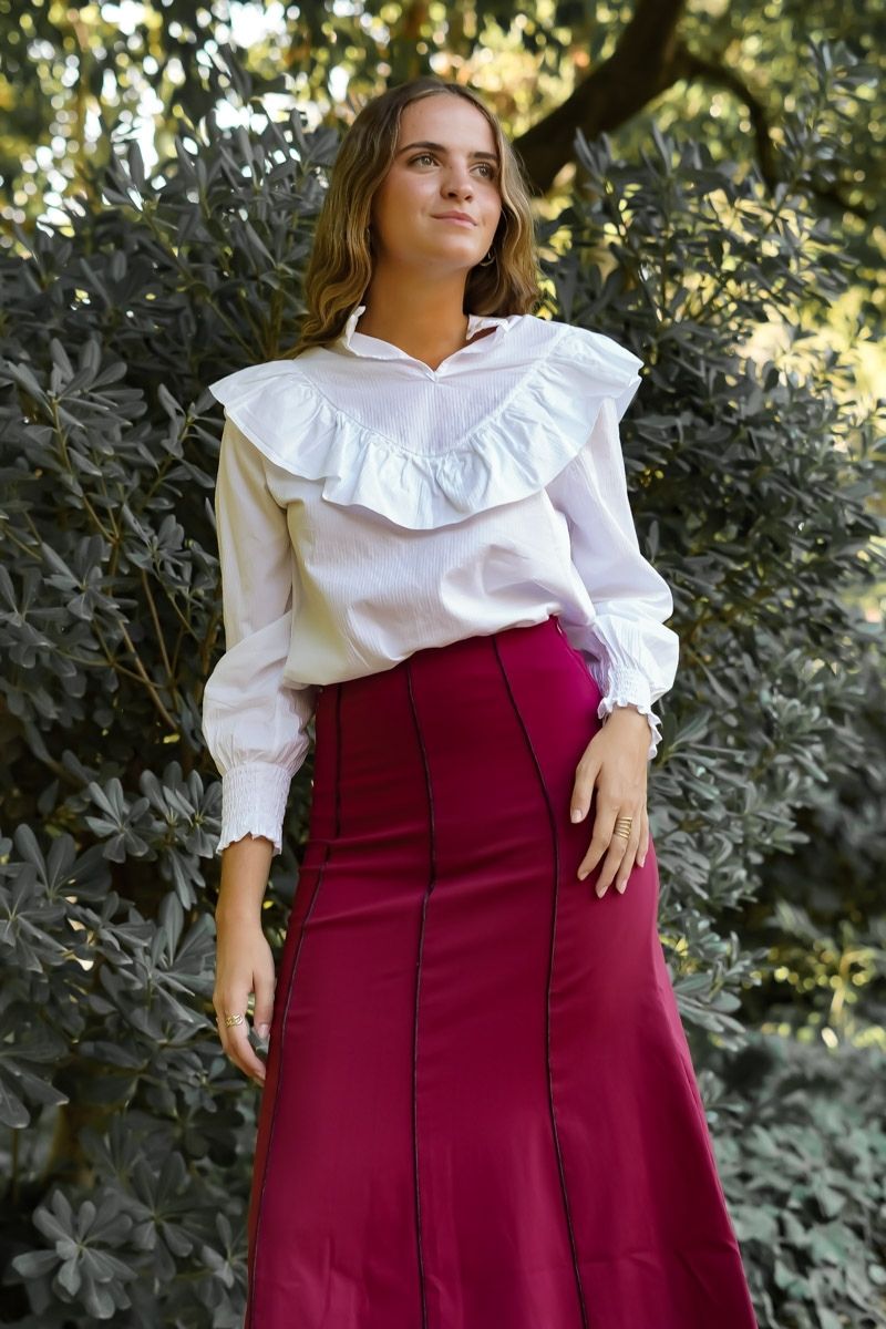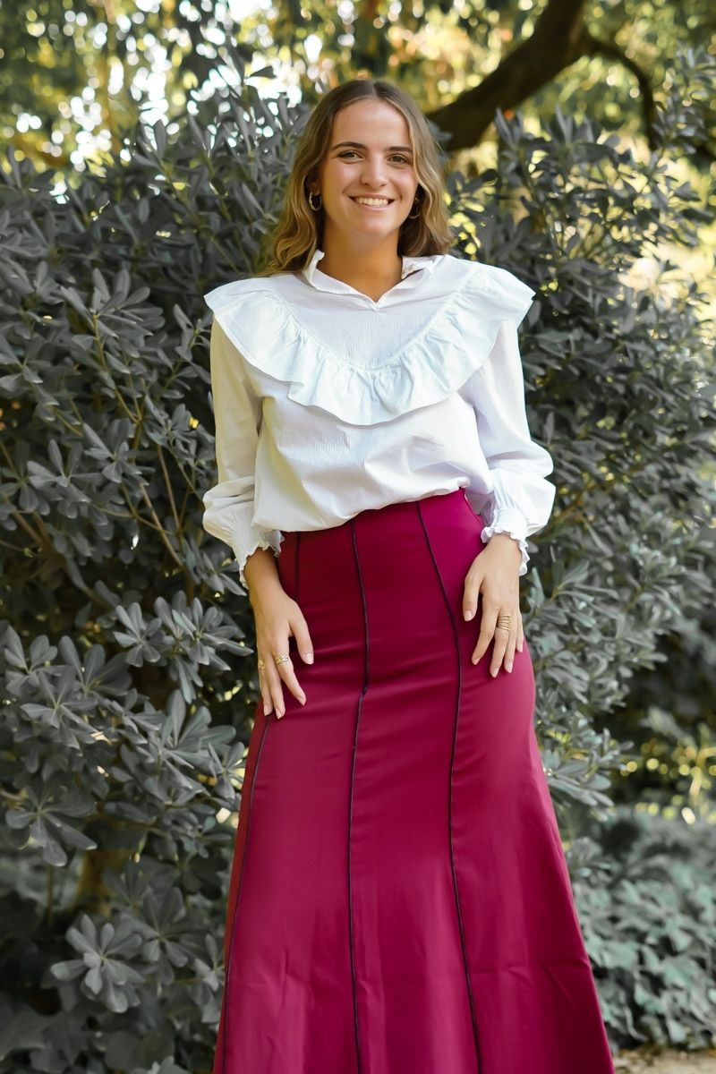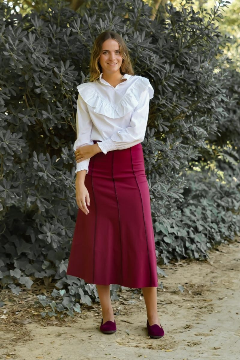 La Falda Burdeos Remates es una falda de popelín elástico con remates en las costuras en color negro. Tiene un largo midi y se adapta a la perfección al cuerpo. Nos parece una prenda ideal para llevar en tu día a día con zapato plano como con taconazo y un look más formal.