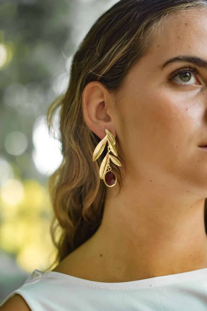 Nuestros Pendientes Olivo son unos pendientes de acero dorado con el cierre en forma de hoja de olivo rematado con una piedra central en color teja, ideal para tus ocasiones más especiales o para regalar. Cierre de tornillo en forma de mariposa y seguro extra de silicona. Se trata de unos pendientes súper versátiles y cómodos con cierre de tornillo que serán el compañero perfecto para cualquier look de estilo formal.