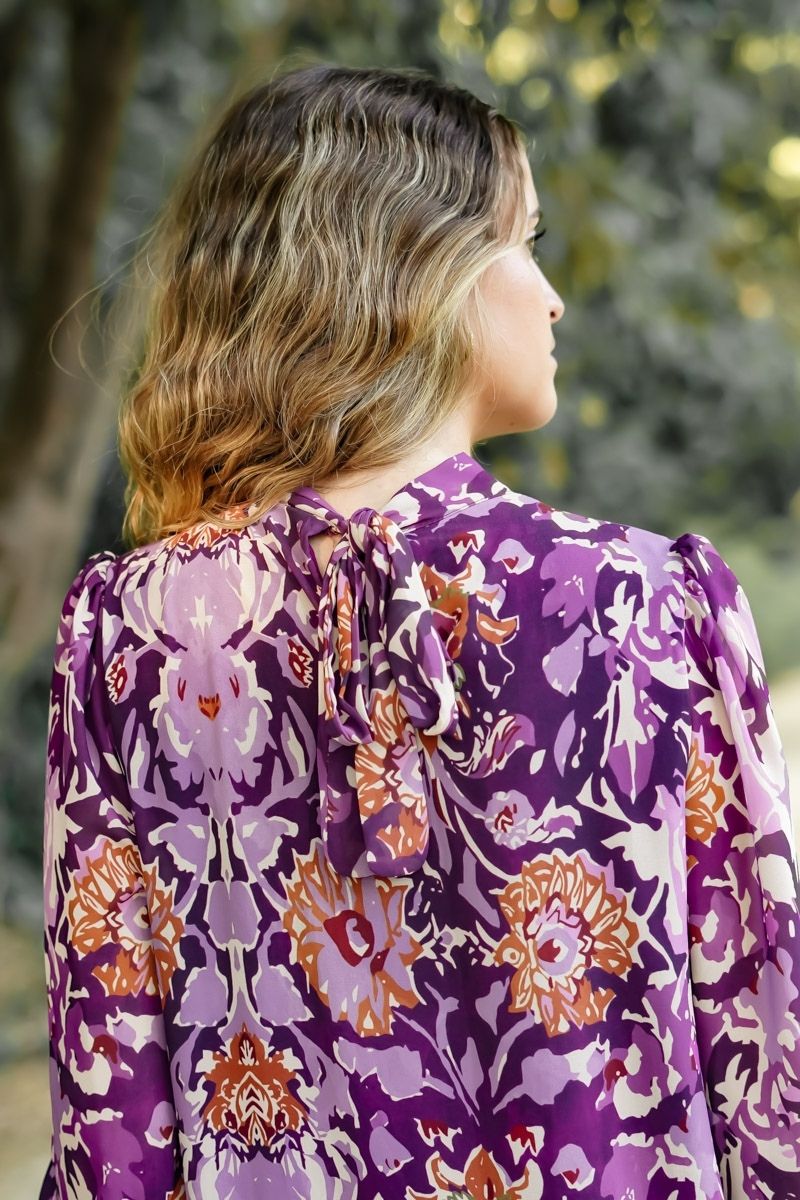 El Vestido Flores Morado es un vestido de manga larga tipo ablusonado confeccionado en tela de gasa estampada con forro interior. Escote cerrado con un lazo en la parte de detrás y diseño suelto, ideal para embarazadas. Este producto es Talla Única y da para una S/M.