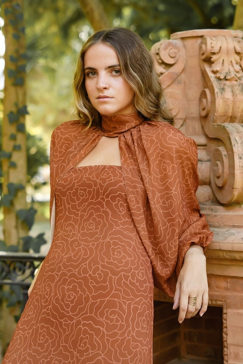 El Vestido Flores Teja es un vestido palabra de honor con una chaqueta de quita y pon d de manga larga tipo ablusonada confeccionado en tela de gasa estampada con forro interior. Escote cerrado con un lazo en la parte de detrás y diseño suelto, ideal para embarazadas. Este producto es Talla Única y da para una S/M.